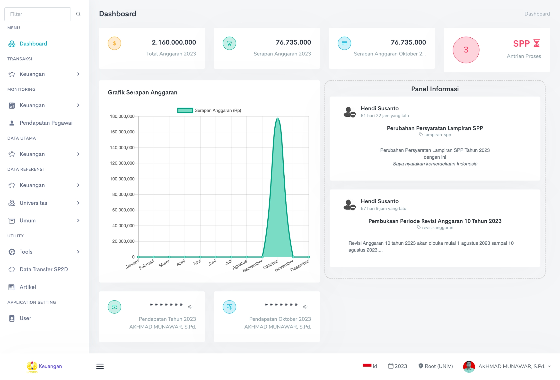 Di halaman utama dashboard terdapat menu ringkasan anggaran tahun berjalan, penggunaan anggaran tahunan, penggunaan anggaran bulanan, serta pendapatan per pegawai dan pendapatan pegawai setiap bulan.